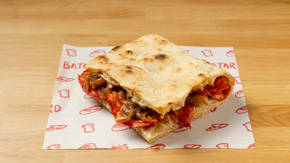Τσιαπάτα με πικάντικο σαλάμι Δράμας, gorgonzola, καραμελωμένο κρεμμύδι και romesco με τοματίνια. Έκρηξη γεύσης.