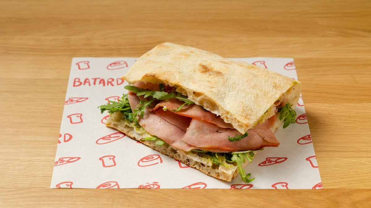Τσιαπάτα με μορταδέλα, βασιλικό, τομάτα , φιστίκι Αιγίνης και κατσικίσια αλοιφωτή. Σάντουιτς πλούσιο και σίγουρο .