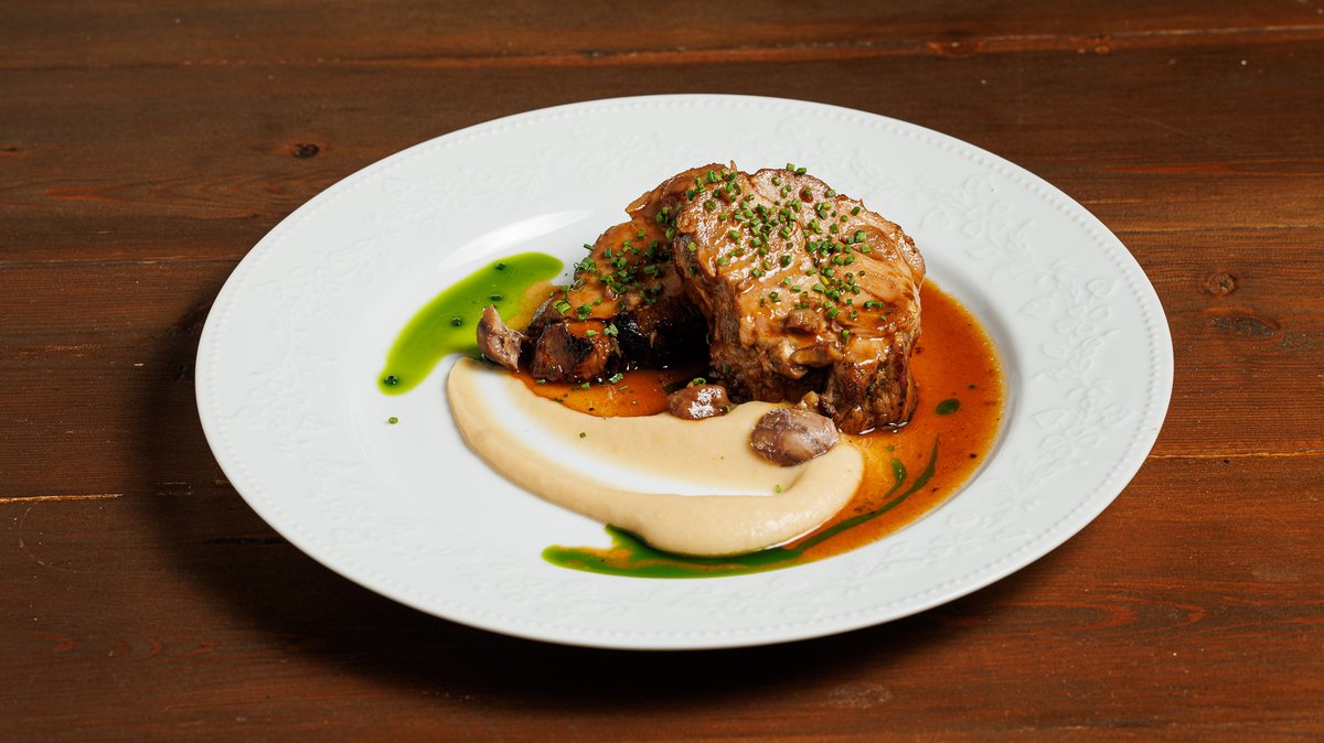 Σιγομαγειρεμένο κότσι μοσχαριού με μικρές πατάτες και γκρεμολάτα μαϊντανού