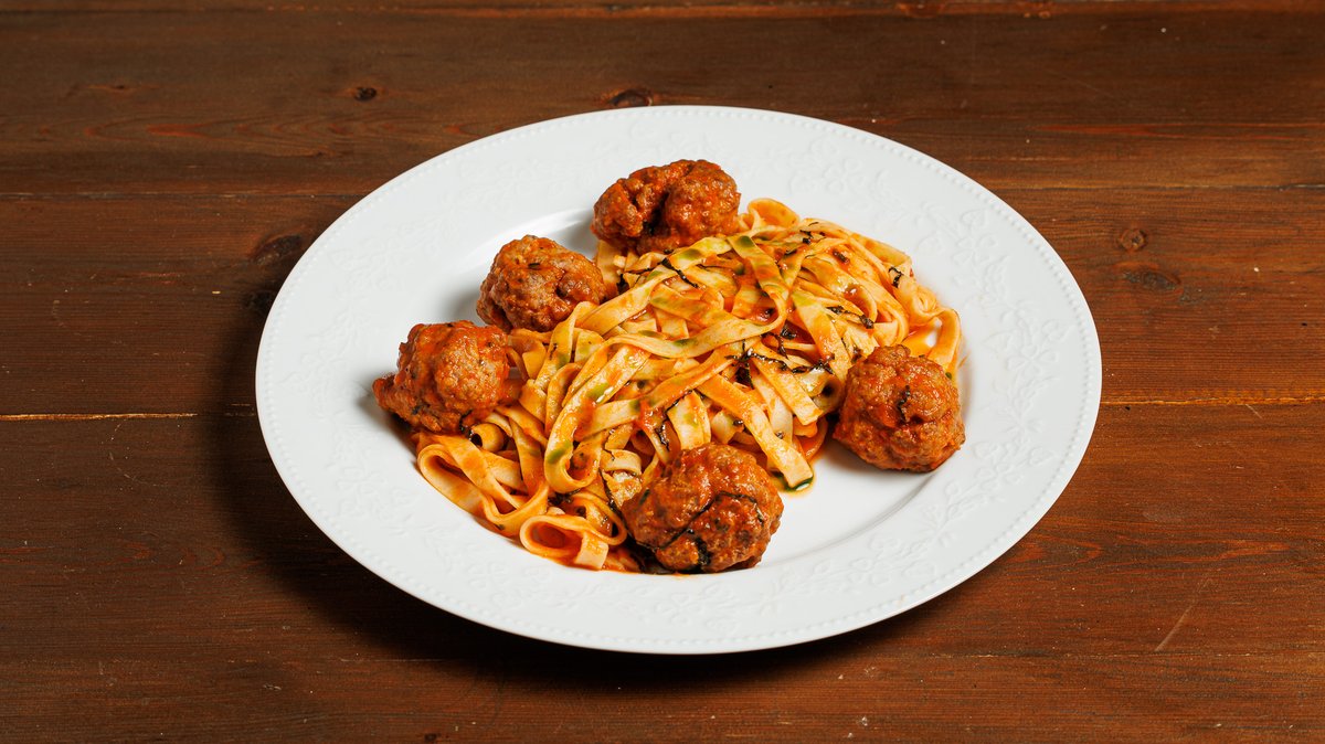 Ταλιατέλες με μοσχαρίσιους κεφτέδες, ελαφριά κόκκινη σάλτσα και παρμεζάνα