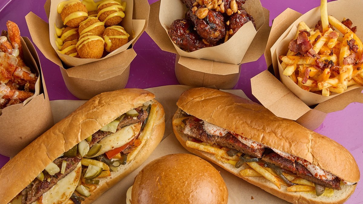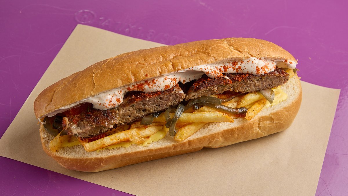 Σάντουιτς με μπιφτέκι προβατίνας, ταλαγάνι σχάρας, ντομάτα και κρεμμύδι, πίκλα αγγούρι, μαγιονέζα και πατάτες
