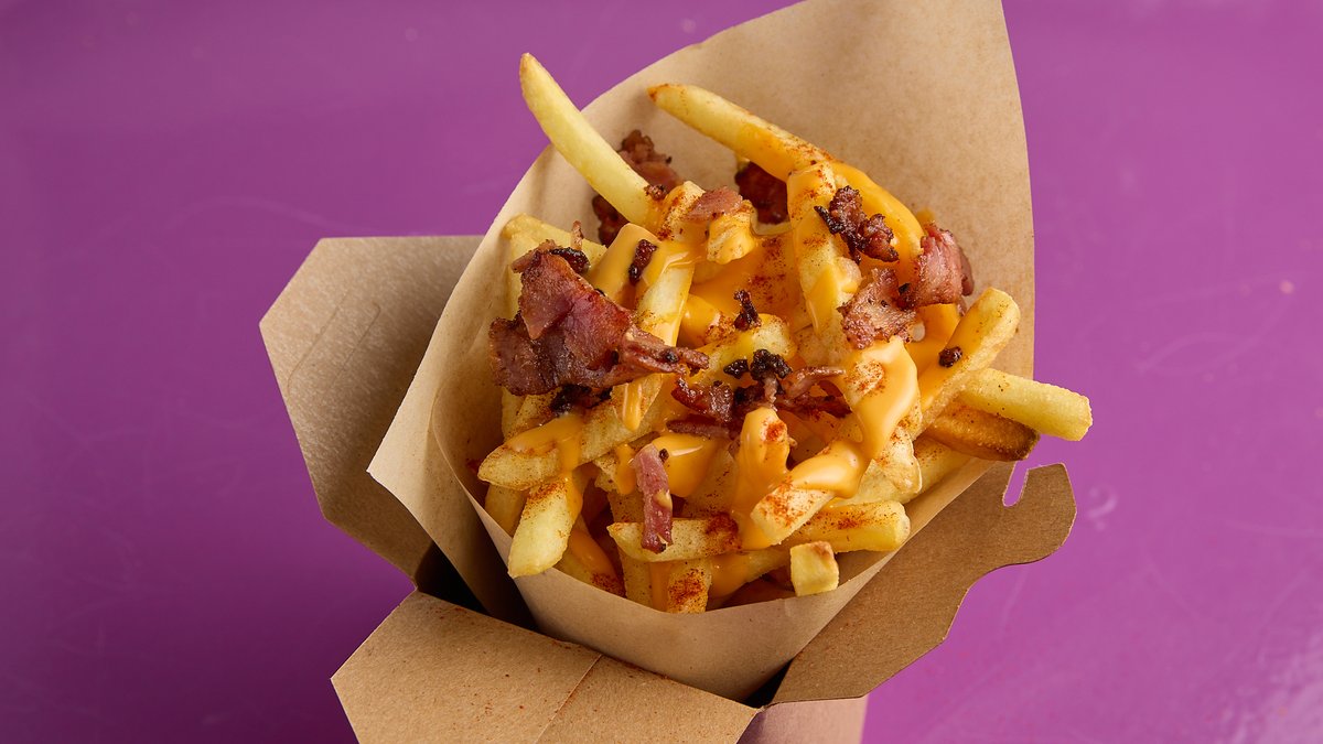Πατάτες τηγανητές με cheddar και bacon σχάρας