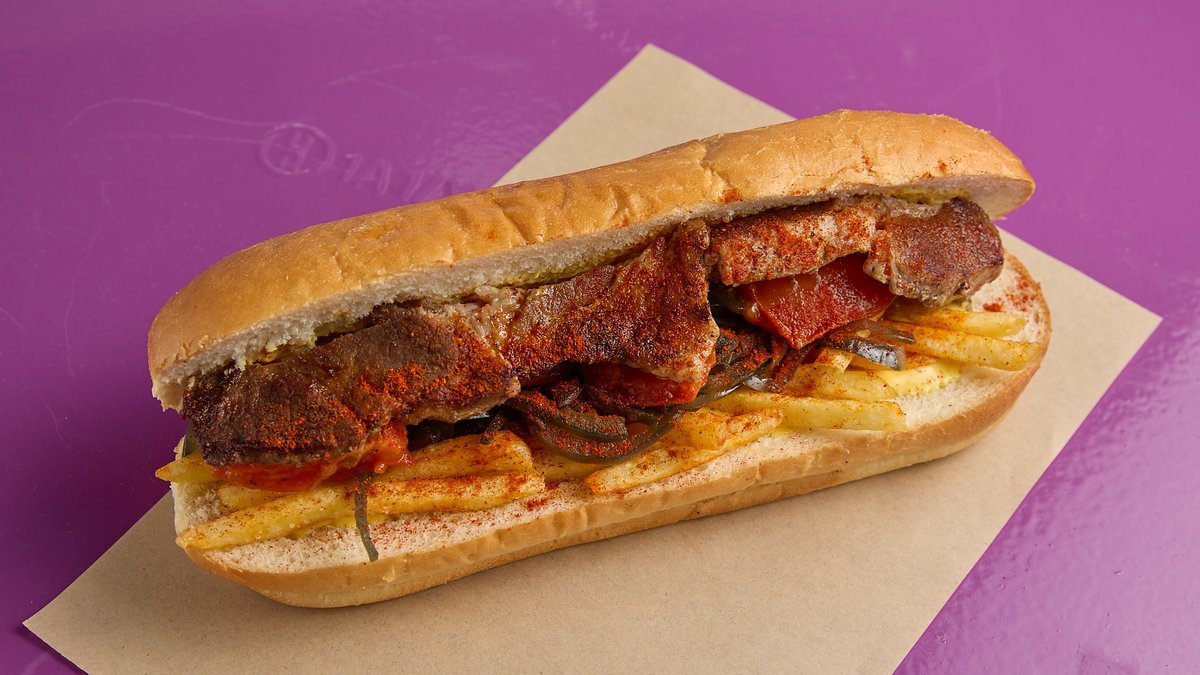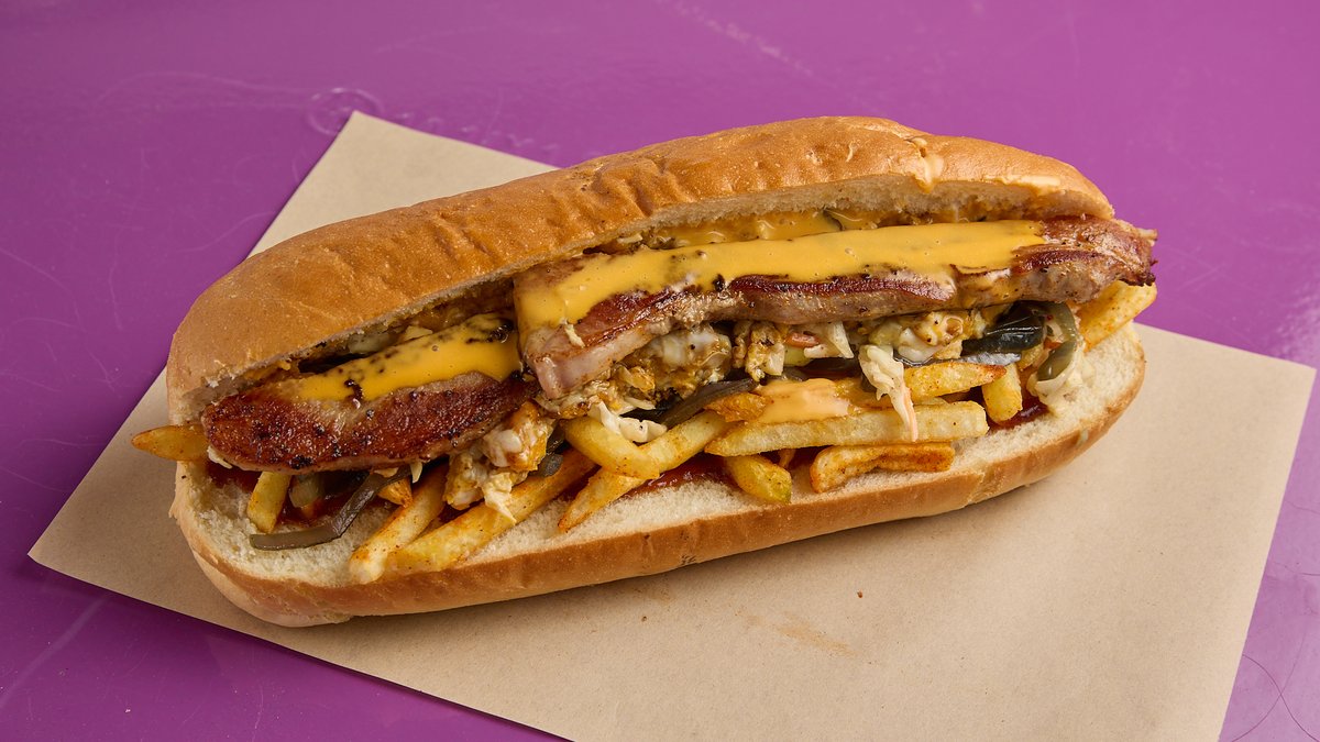 Sandwich με καλαμάκι χοιρινό, μουστάρδα, κρεμμύδι, ντομάτα, ταλαγάνι, πατάτες