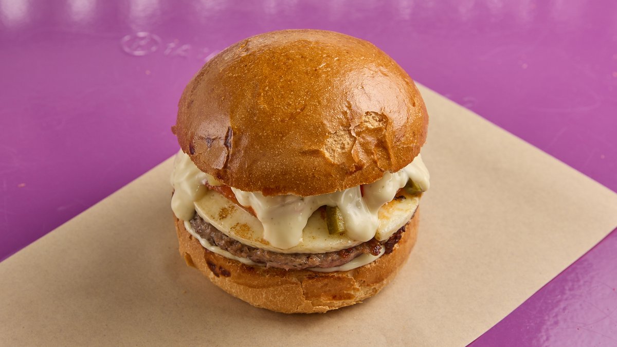 Sandwich με μοσχαρίσιο κιμά, κρεμμύδι σχάρας, τσένταρ, τυροκαυτερή, hot sauce