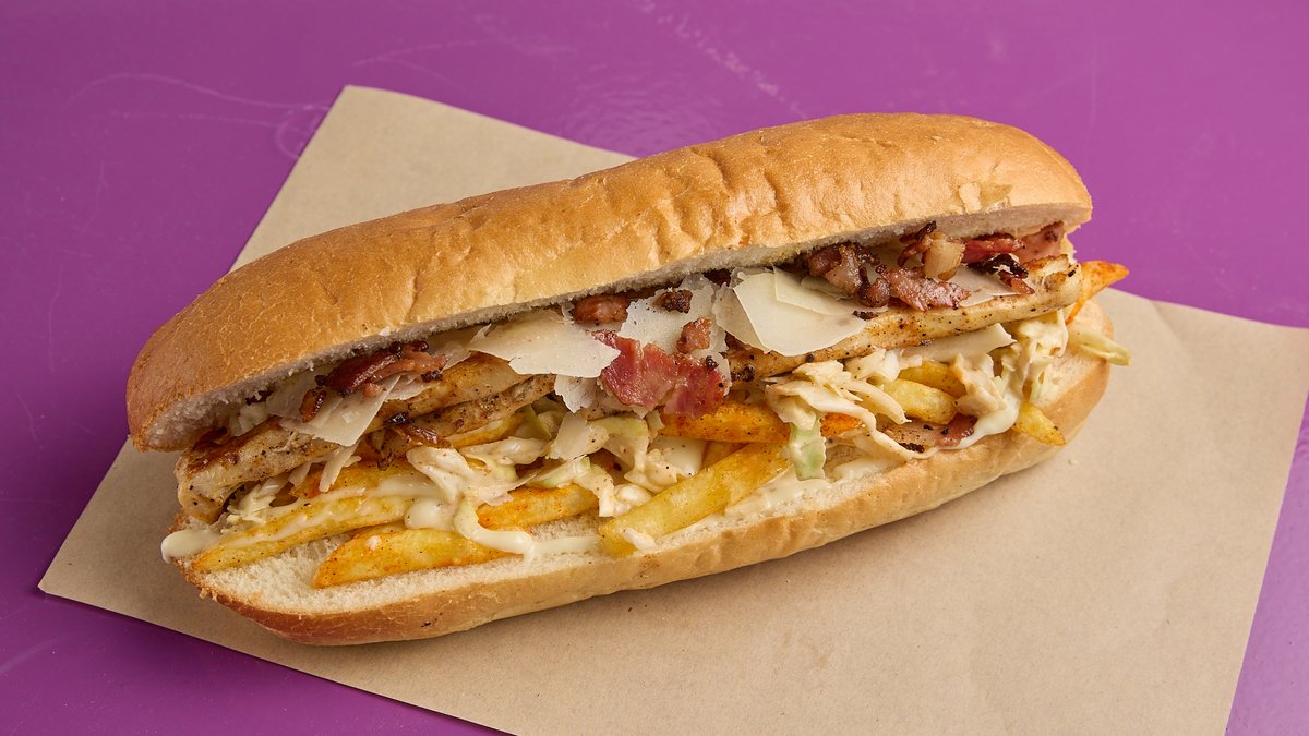 Sandwich με καλαμάκι κοτόπουλο, μαγιονέζα, παρμεζάνα, μπέικον, πατάτες