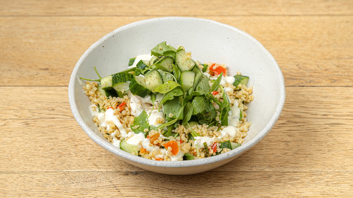πλιγούρι,βραστό κοτόπουλο,αγγούρι,τοματίνια,γιαούρτι λεμονιού,σχοινόπρασο και baby ρόκα