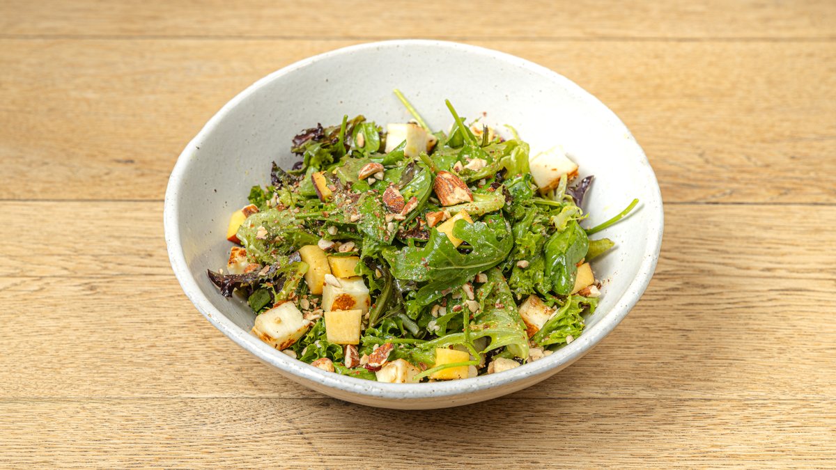 πράσινη σαλάτα,baby σπανάκι,φρούτα εποχής,cranberries,αμύγδαλο,χαλούμι και house dressing