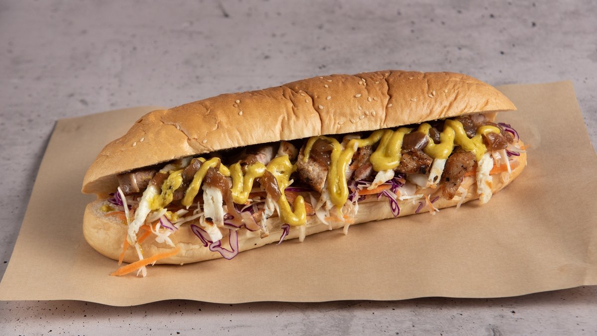 Ψωμί sandwich με χοιρινή πανσέτα, ταλαγάνι, λαδολέμονο με μουστάρδα, λάχανο και καρότο