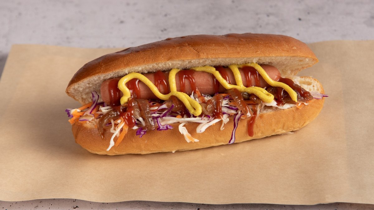 Ψωμί brioche με λουκάνικο Φρανκφούρτης, λάχανο, καρότο, καραμελωμένο κρεμμύδι, ketchup και μουστάρδα
