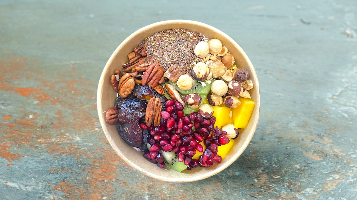 Με μαγκο,ακτινίδιο, ρόδι,μπανάνα, καρύδι πεκαν, φουντούκια, βασιλικοι χουρμάδες, βρώμη, αλεσμένο λιναροσπορο, σπόροι chia,κανέλα. Ενα υγιεινό bowl γεματο φυτικες ινες, πεεβιοτικα,βιταμίνες και ιχνοστοιχεία, πρωτεϊνη, αντιοξειδωτικά. Ενα πλήρες θρεπτικό bowl.χωρις ζαχαρη ,χωρίς γαλακτομικα,και vegan. Εαν θέλετε μπορείτε να προσθέσετε extra βουτηρα καρπών και γλυκαντικα επιλογης σας. Χωρητικότητα του bowl 750ml.