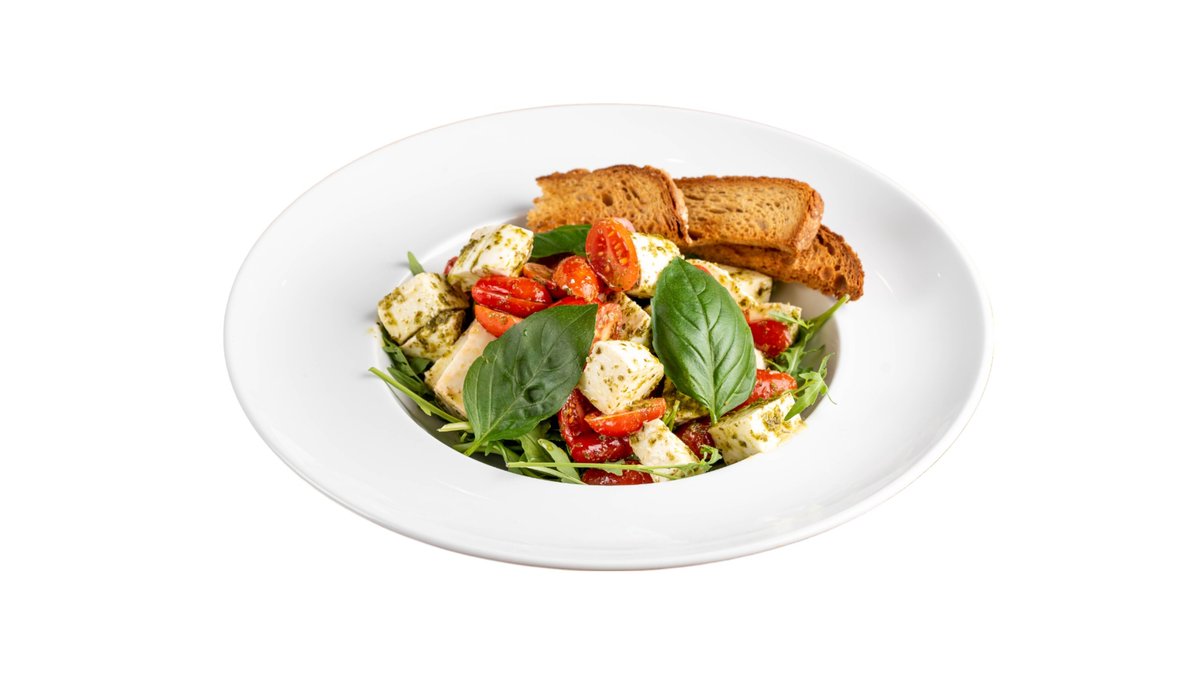 Με μοτσαρέλα, pesto, προσούτο crudo και flakes παρμεζάνας. Συνοδεύεται από πατάτες τηγανητές ή φρέσκια σαλάτα