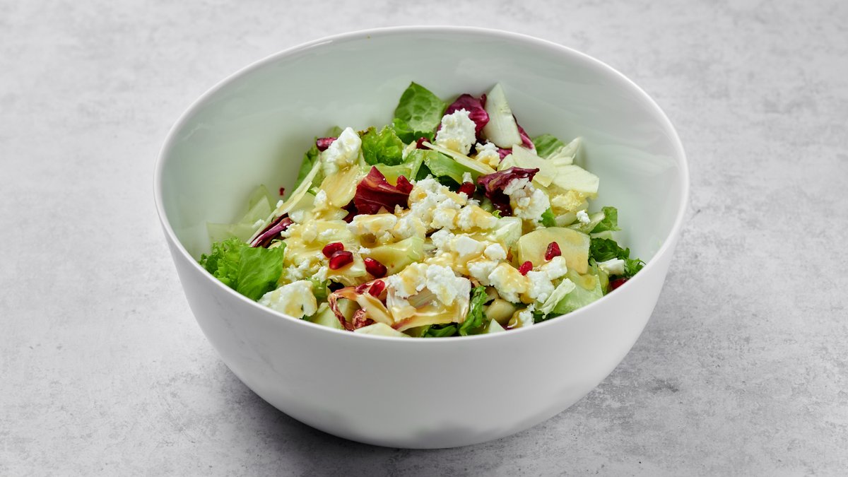 Σαλάτα με gorgonzola, σπανάκι baby, ραντίτσιο, iceberg, αχλάδι posset και vinaigette μελιού