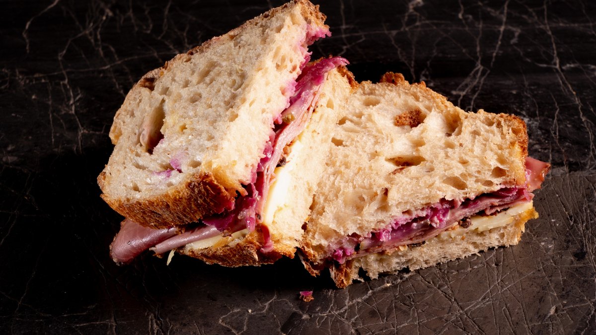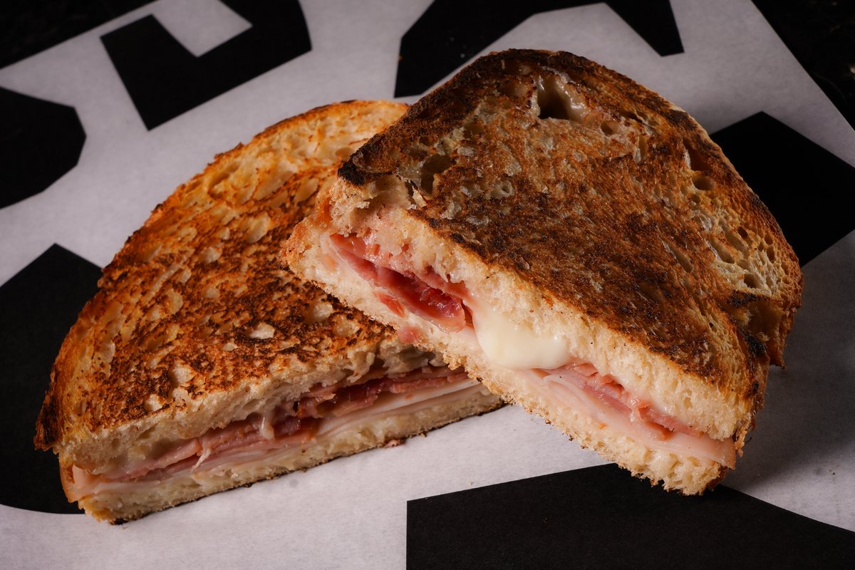 Γκούντα και τσένταρ που λιώνουν, σε συνδυασμό με εκλεκτό προσούτο κότο, μέσα σε φέτες από το αφράτο προζυμένιο ψωμί μας, ψημένο αργά στο μαντέμι για τέλειο χρυσαφένιο αποτέλεσμα. / Melted gouda and cheddar, paired with premium prosciutto cotto, tucked between slices of our fluffy sourdough bread, slowly grilled on cast iron for a perfectly golden finish.