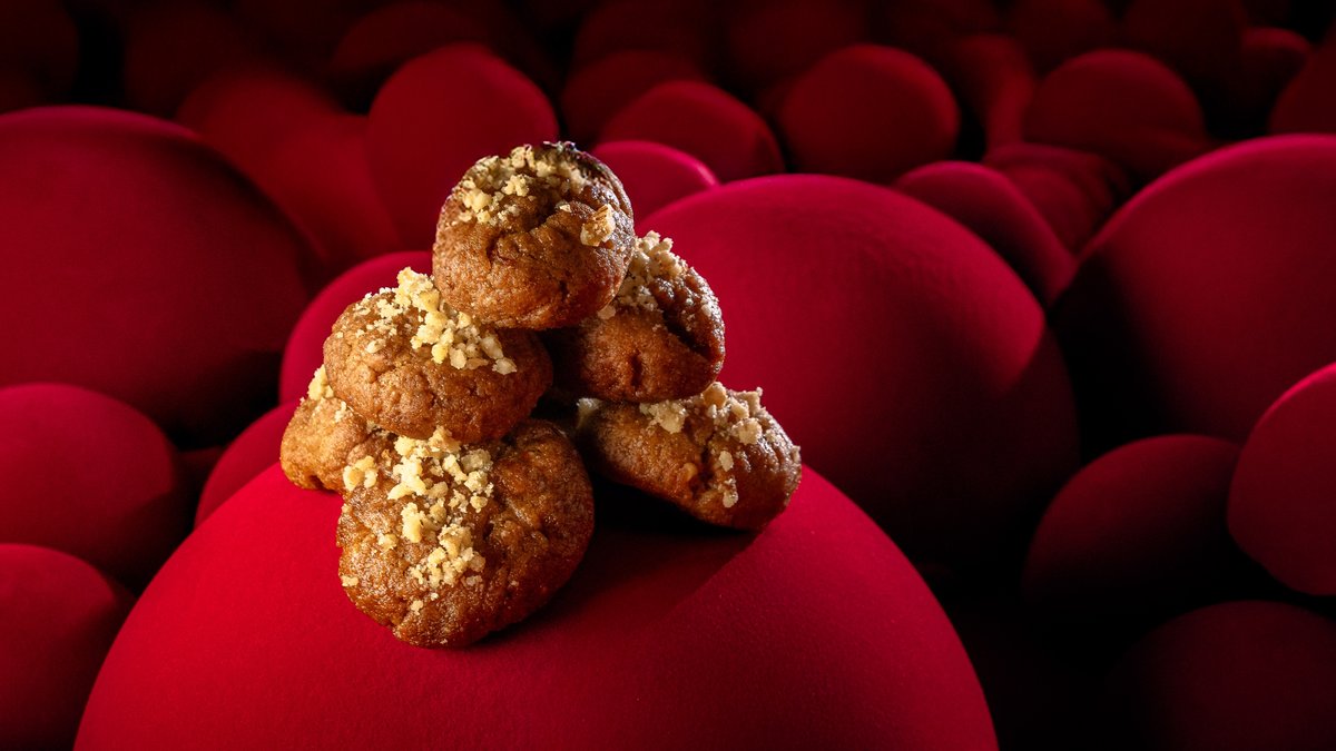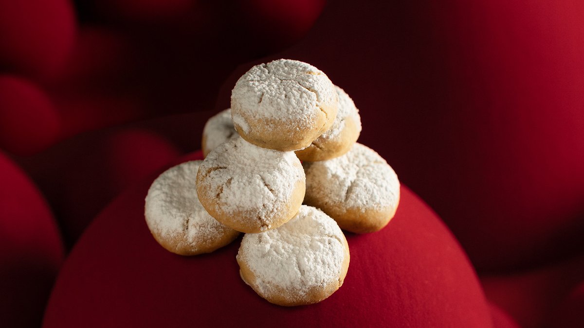 Κουραμπιέδες με καβουρδισμένα αμύγδαλα, ισορροπία αιγοπρόβειου και αγελαδινού φρέσκου βουτύρου, πασπαλισμένοι με άχνη. / Kourabiedes with roasted almonds, a balanced blend of goat–sheep and cow fresh butter, finished with a dusting of powdered sugar.