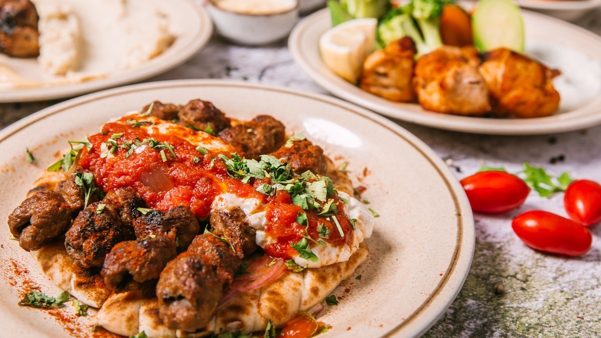 Με πίτα, κόκκινη σάλτσα, σως γιαούρτι, πάπρικα και μαϊντανό