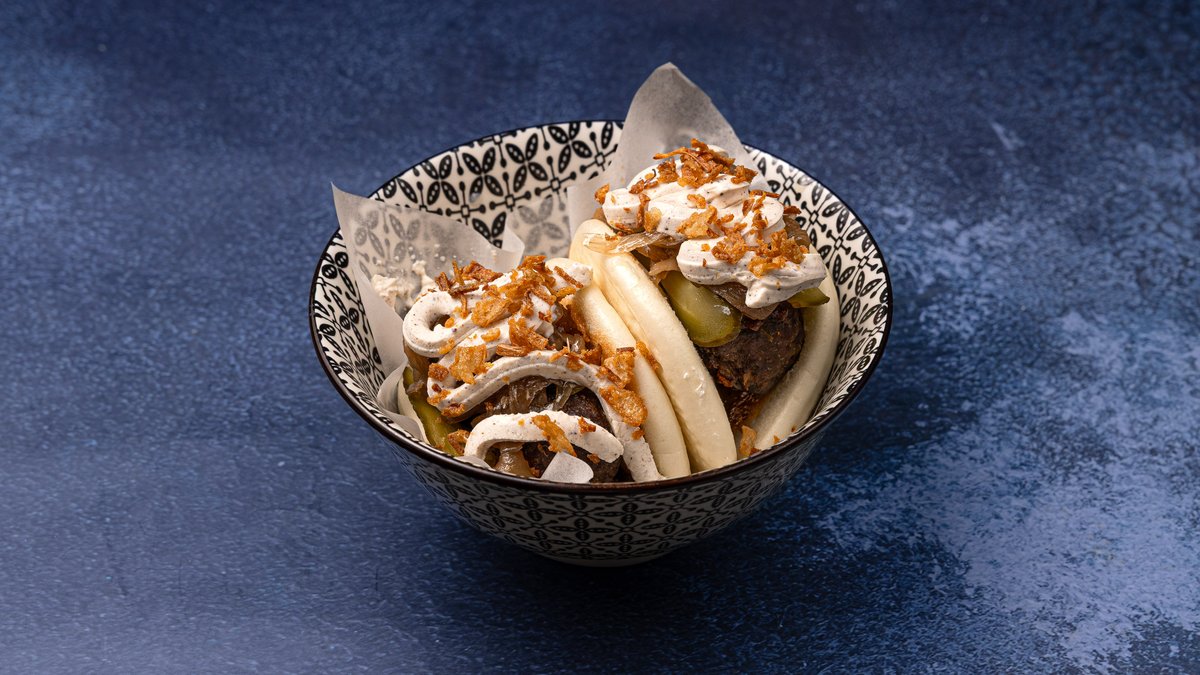 Μοσχαρίσια κεφτεδάκια, umami sauce, πίκλες, καραμελωμένα κρεμμύδια, αρωματισμένο τυρί κρέμα και crispy κρεμμύδι