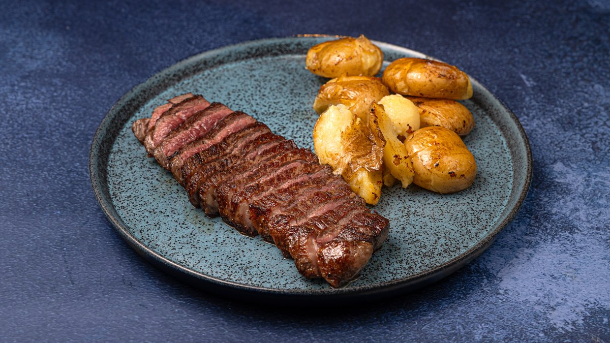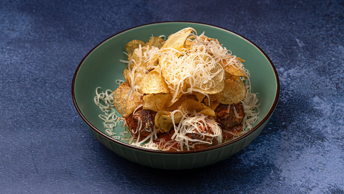 Μοσχαρίσια κεφτεδάκια με κόκκινη σάλτσα, γραβιέρα και πατάτες twister