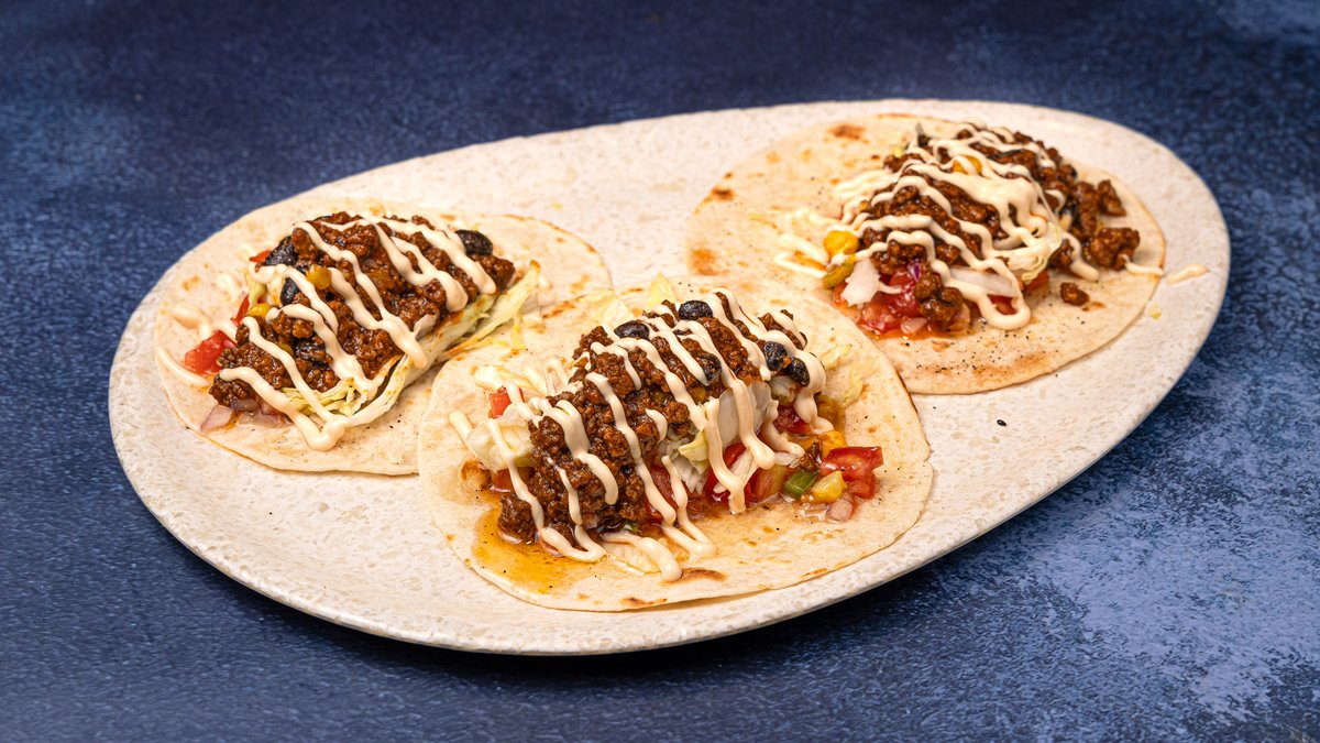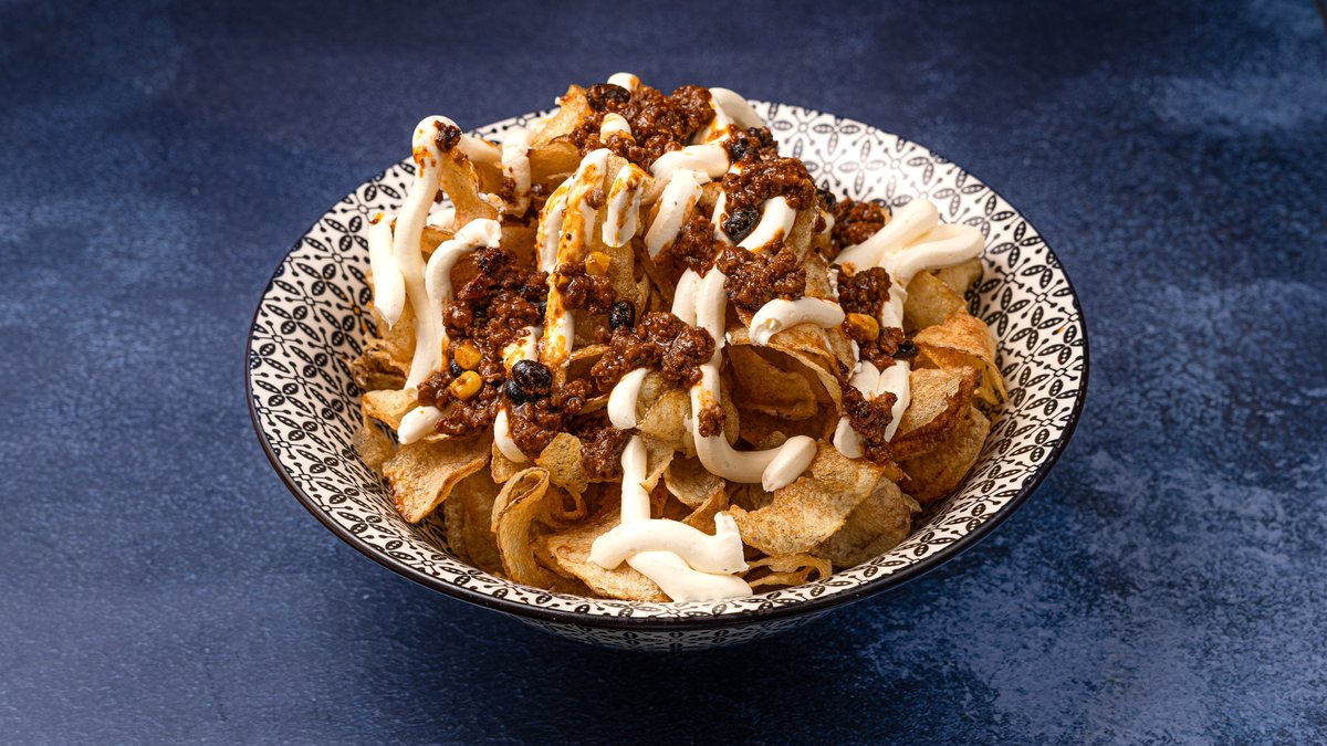Πικάντικος μοσχαρίσιος κιμάς, chili con carne, καλαμπόκι, μαύρο φασόλι, iceberg, pico de gallo, sour cream, chipotle mayo
