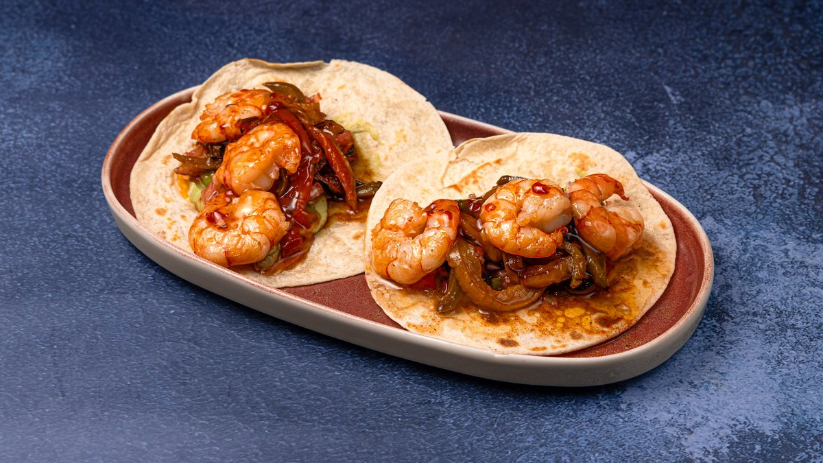 2 Τεμάχια. Γαρίδες σοτέ, guacamole, πολύχρωμες πιπεριές, sweet chilli και pico de gallo