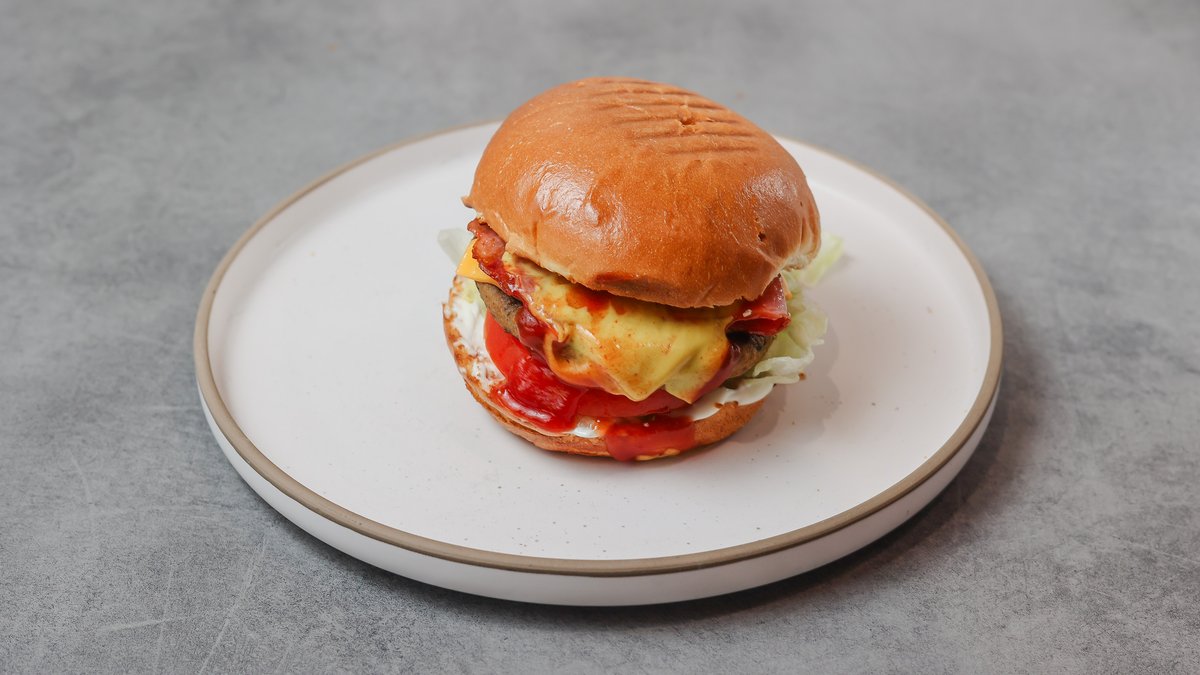 With beef burger, bacon, cheddar, iceberg, tomato, ketchup, mustard and mayonnaise