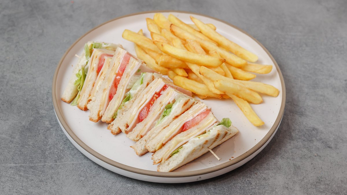 With cheese, ham, bacon, tomato, lettuce and mayonnaise. Accompanied by fries
