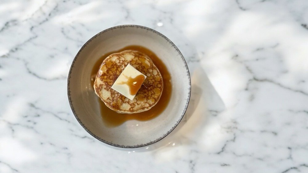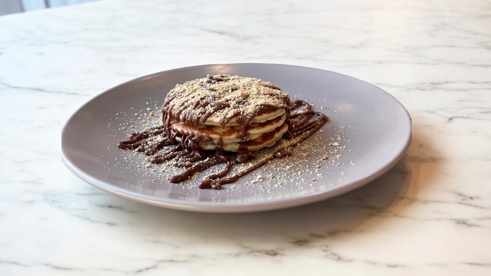 3 pancakes, αυγά ποσέ, σπανάκι, φύτρες sauce hollandaise