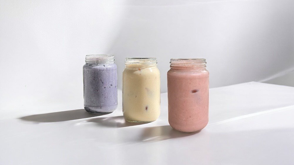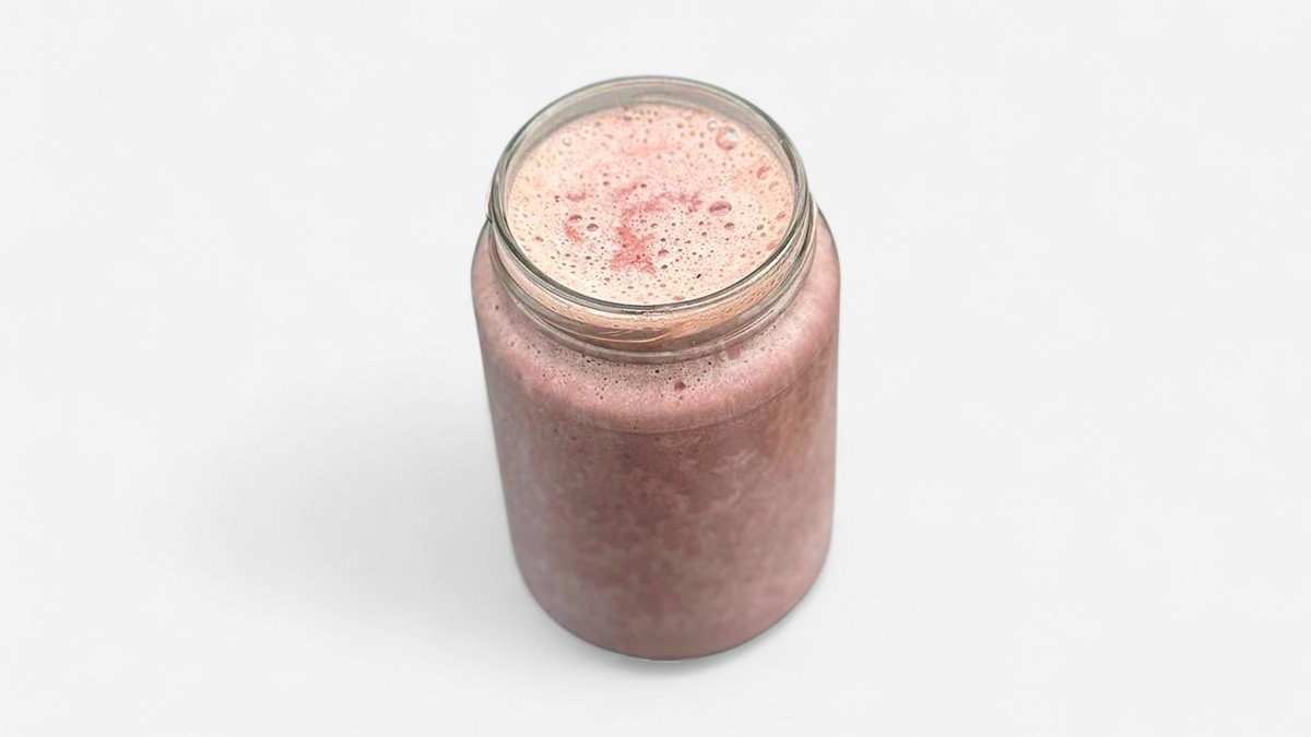 Mixed Berries, Biosteel Vanilla Protein Powder, honey, and pea milk.