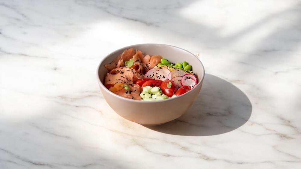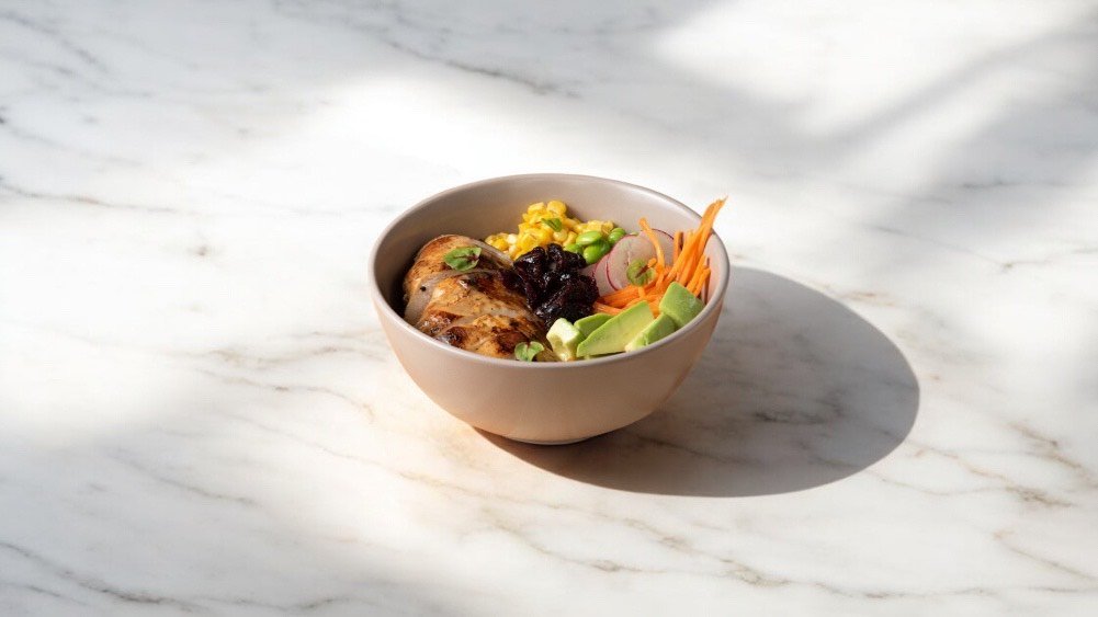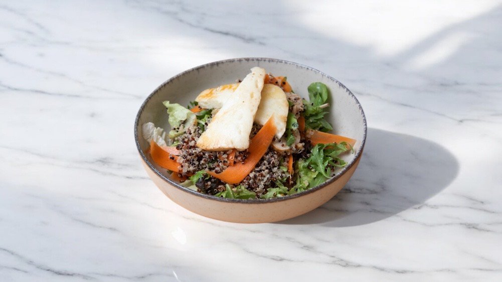 Δίχρωμη κινόα, κοτόπουλο, ποικιλία από φρέσκα φύλλα σαλάτας, flakes καρότου, ψητό φιλέτο κοτόπουλο, χαλούμι και vinaigrette από λευκό βαλσάμικο, δυόσμο και lime