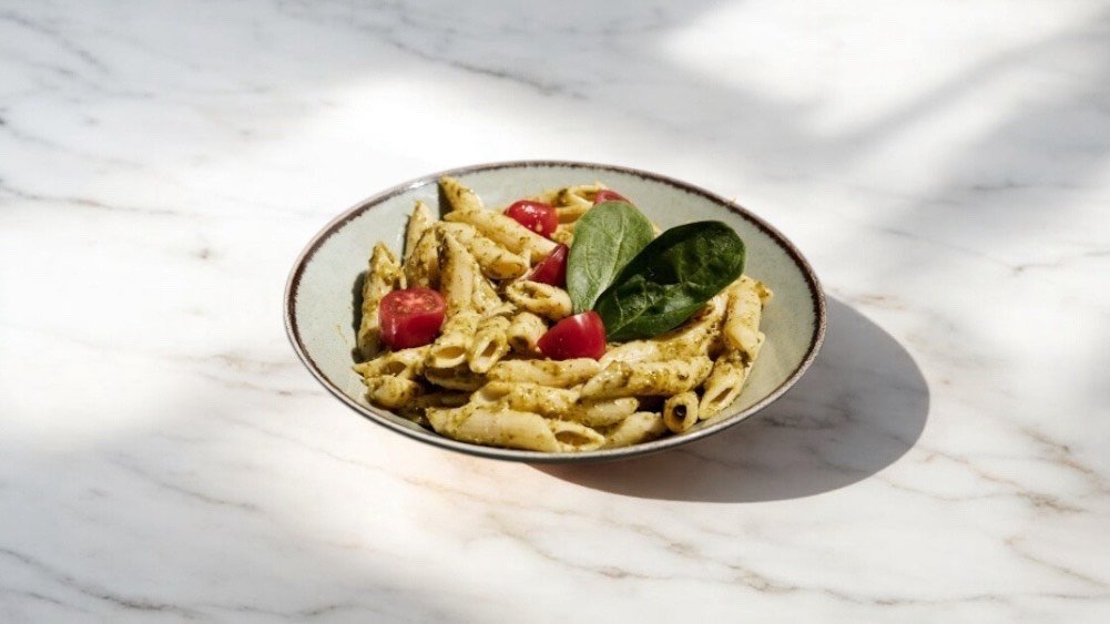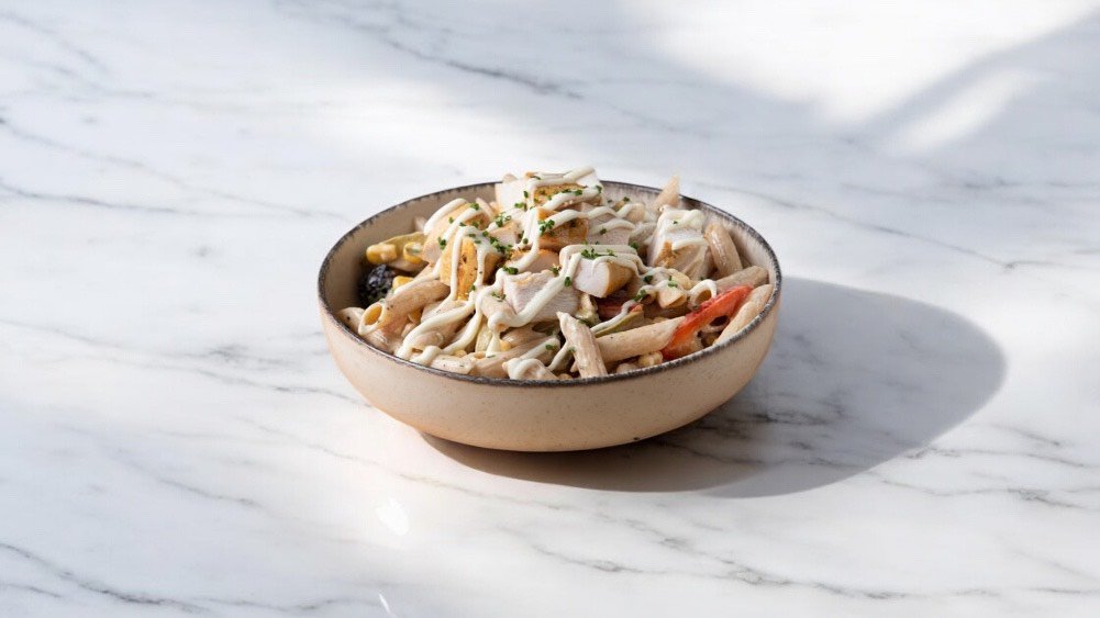 Πέννες , κοτόπουλο, καλαμπόκι, σωτέ (πιπεριά, κολοκύθι, κρεμμύδι), chives, lime, cranberries, truffle mayo
