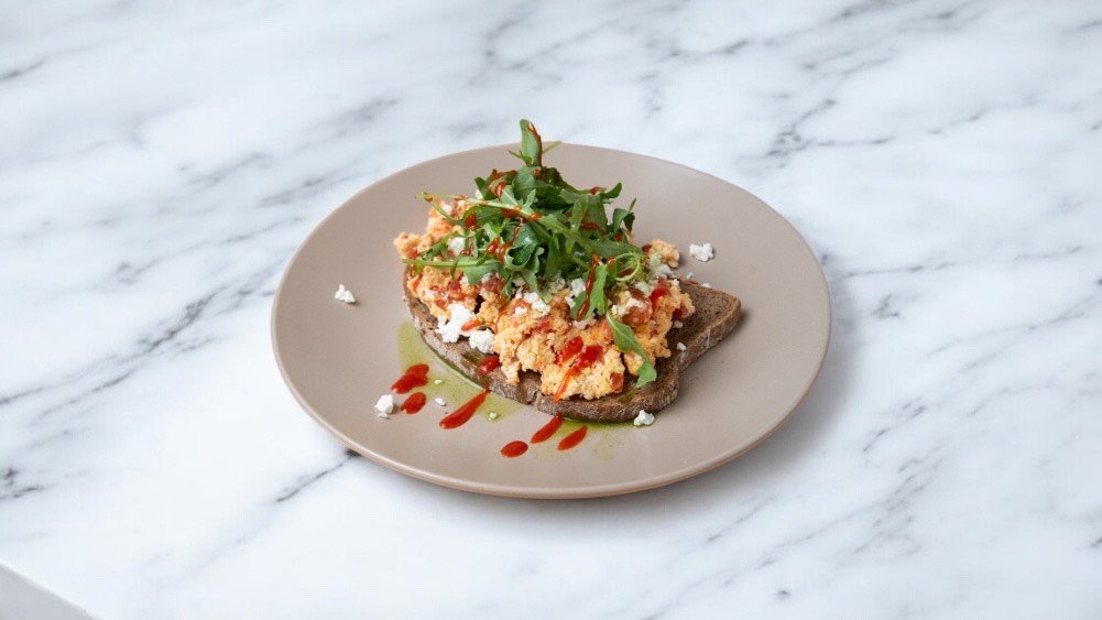 Αυγά στραπατσάδα με χωριάτικο λουκάνικο πάνω σε ψωμί αργής ωρίμανσης, φέτα, sriracha και baby ρόκα