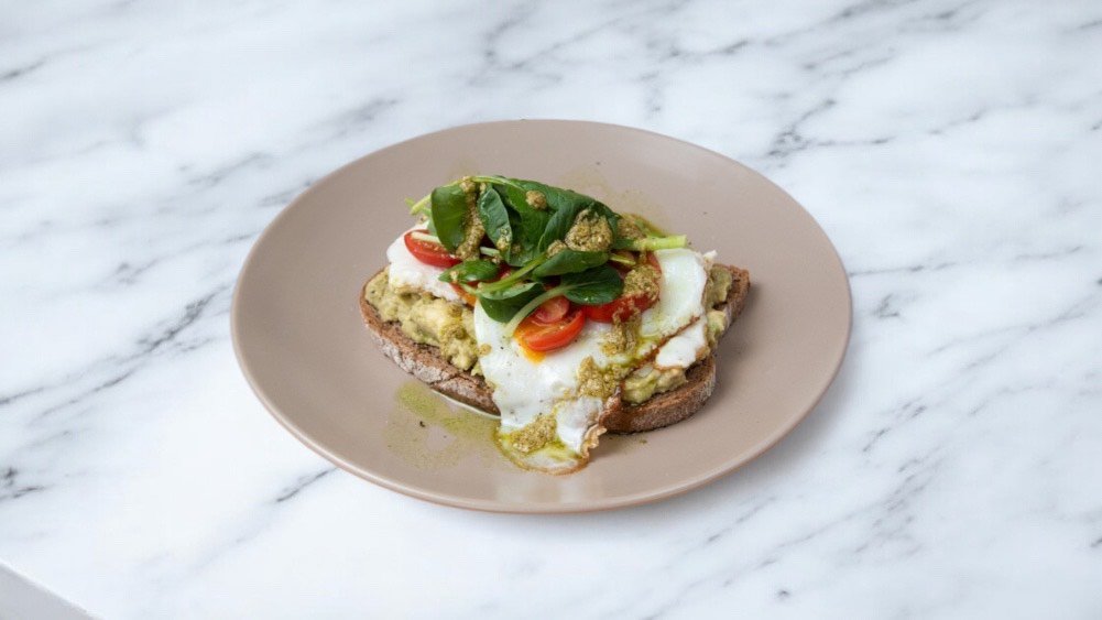 Αυγά τηγανιτά, ψωμί αργής ωρίμανσης, ντοματίνια, baby σπανάκι, αβοκάντο, sauce από pesto βασιλικού