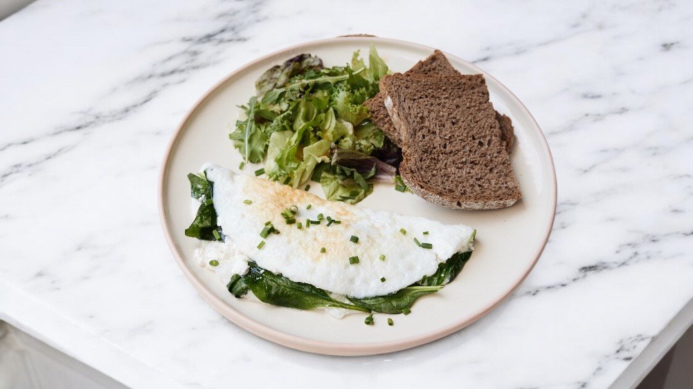 Ομελέτα με ασπράδια, σπανάκι, φέτα, ντοματίνια. Συνοδεύεται με σαλάτα και ψωμί αργής ωρίμανσης