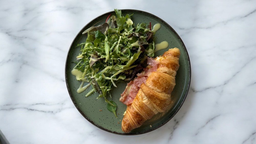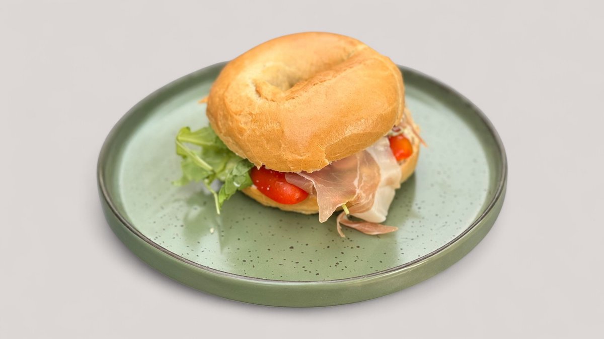 Bagel με λευκό ψωμί, γαλλικό καπνιστό ζαμπόν, τηγανητό αυγό, μαγιονέζα και λιωμένο τυρί emmental