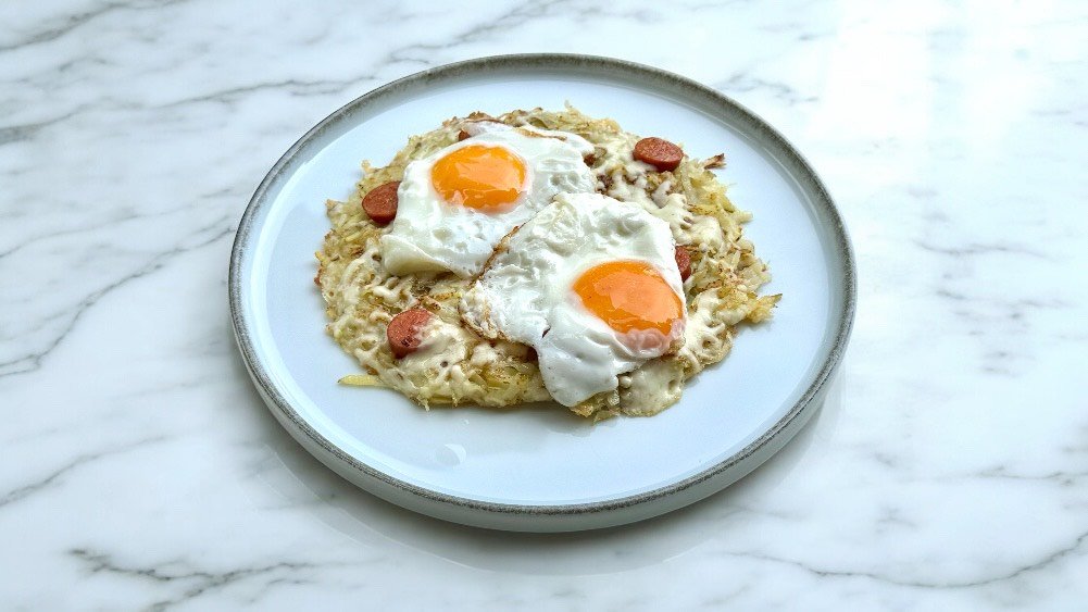 Τριμμένη πατάτα με emmental, λουκάνικο από χοιρινό κρέας και 2 τηγανητά αυγά
