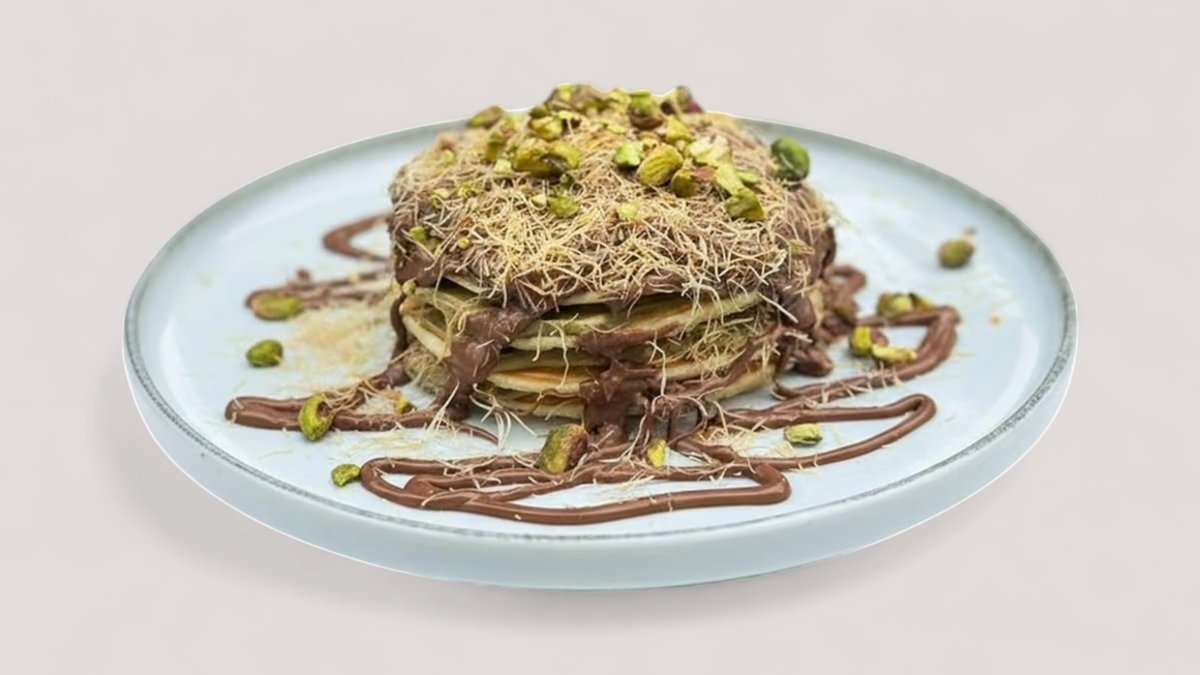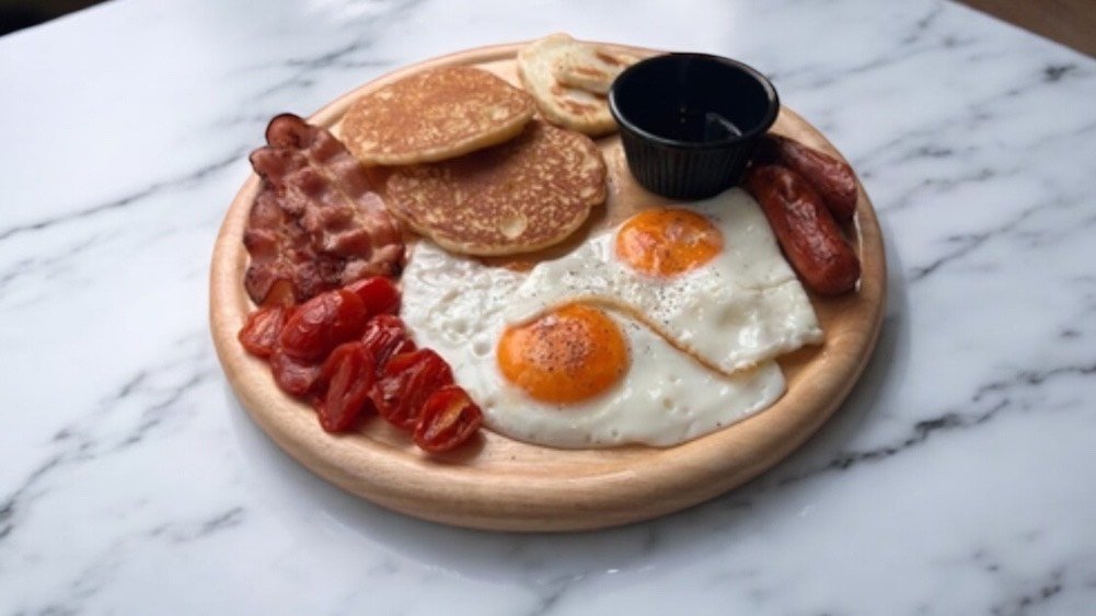2 pancakes, bacon, λουκάνικο, ψητά ντοματίνια, χαλούμι και sriracha με maple syrup