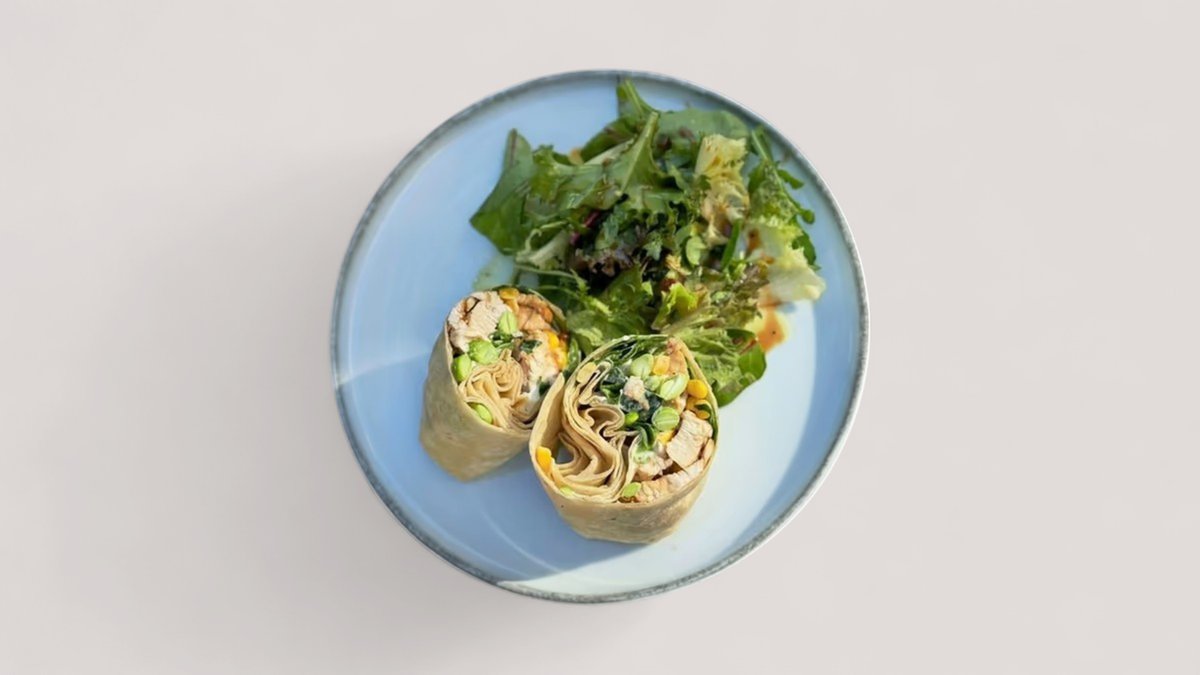 Scramble eggs, chives, maple – srirasha sauce, bacon, αγγούρι μεσα σε μπουριτο. Σερβιρεται με Σαλατα
