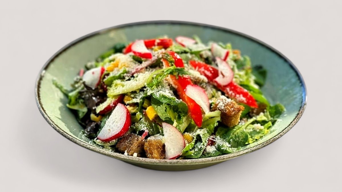 Ποικιλια απο φρεσκα φυλλα σαλατας, κρουτον, παρμεζανα, πιπερια, καλαμποκι , ραπανακι, chives και βινεγρετ βερικοκο