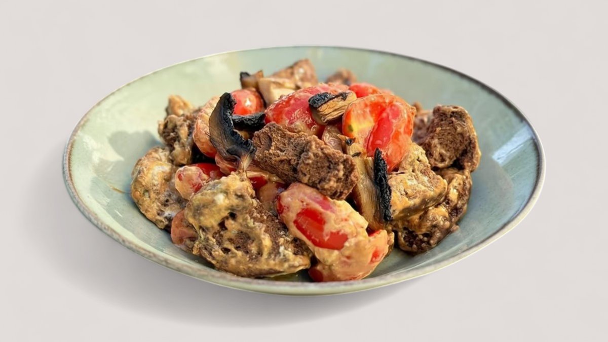 Ομελέτα με emmental, γαλοπούλα, μανιτάρια, πιπεριά. Συνοδεύεται με σαλάτα και ψωμί αργής ωρίμανσης