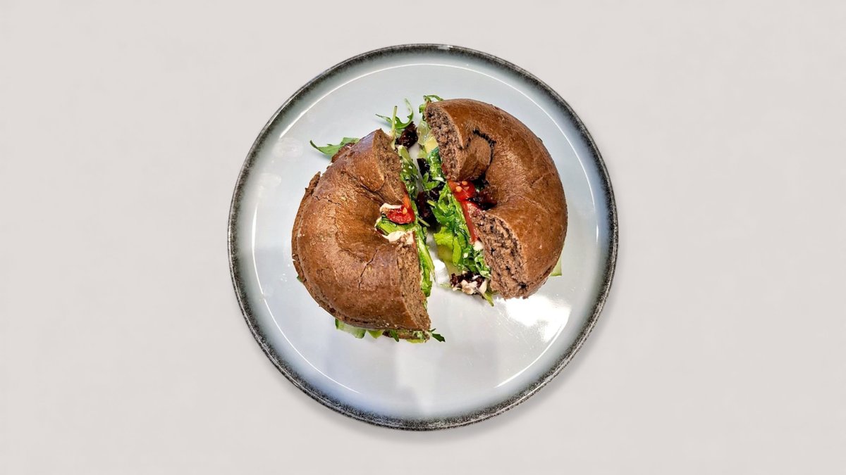 Bagel ολικης, με αβοκαντο, αγγουρι, λιαστη ντοματα, ροκα, και χουμους