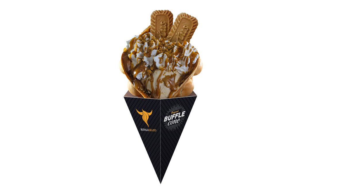 Βανίλια βάφλα,Biscoff caramel παγωτό, Biscoff πραλίνα, καραμέλα βουτύρου, Biscoff μπισκότα και σαντιγί
