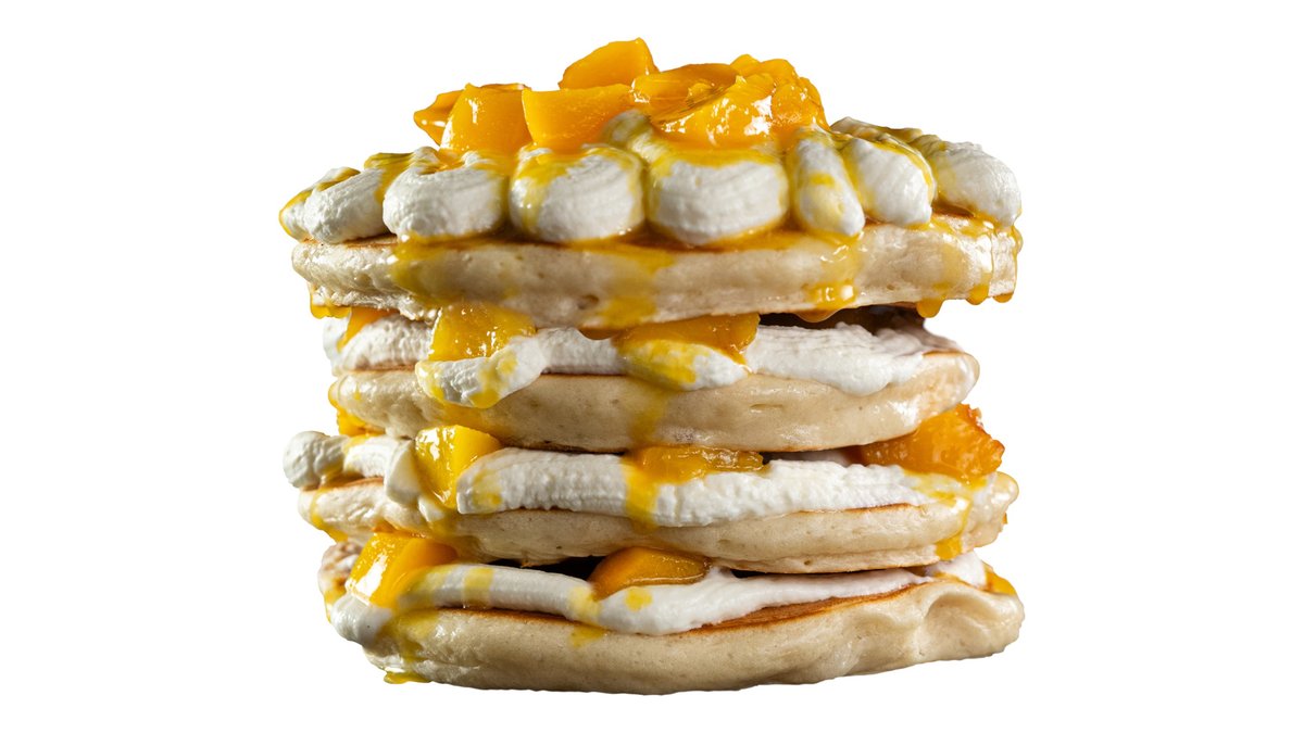 Τέσσερα Βανίλια Pancakes, ροδάκινο, κρέμα γιαουρτιού και πουρές passion fruit