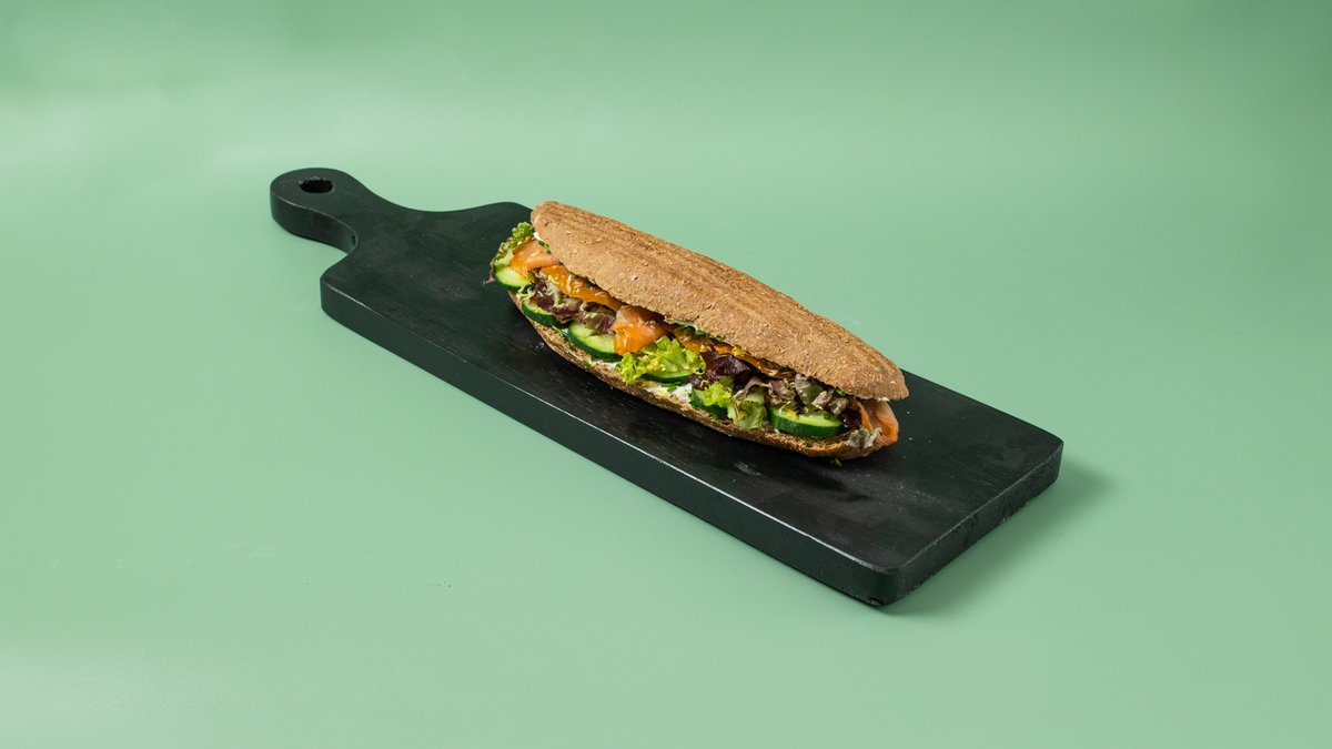 Μπαγκέτα ολικής άλεσης με σολομό, αγγούρι, λόλα κόκκινη και πράσινη, ξύσμα λεμόνι , philadelphia και σχοινόπρασο