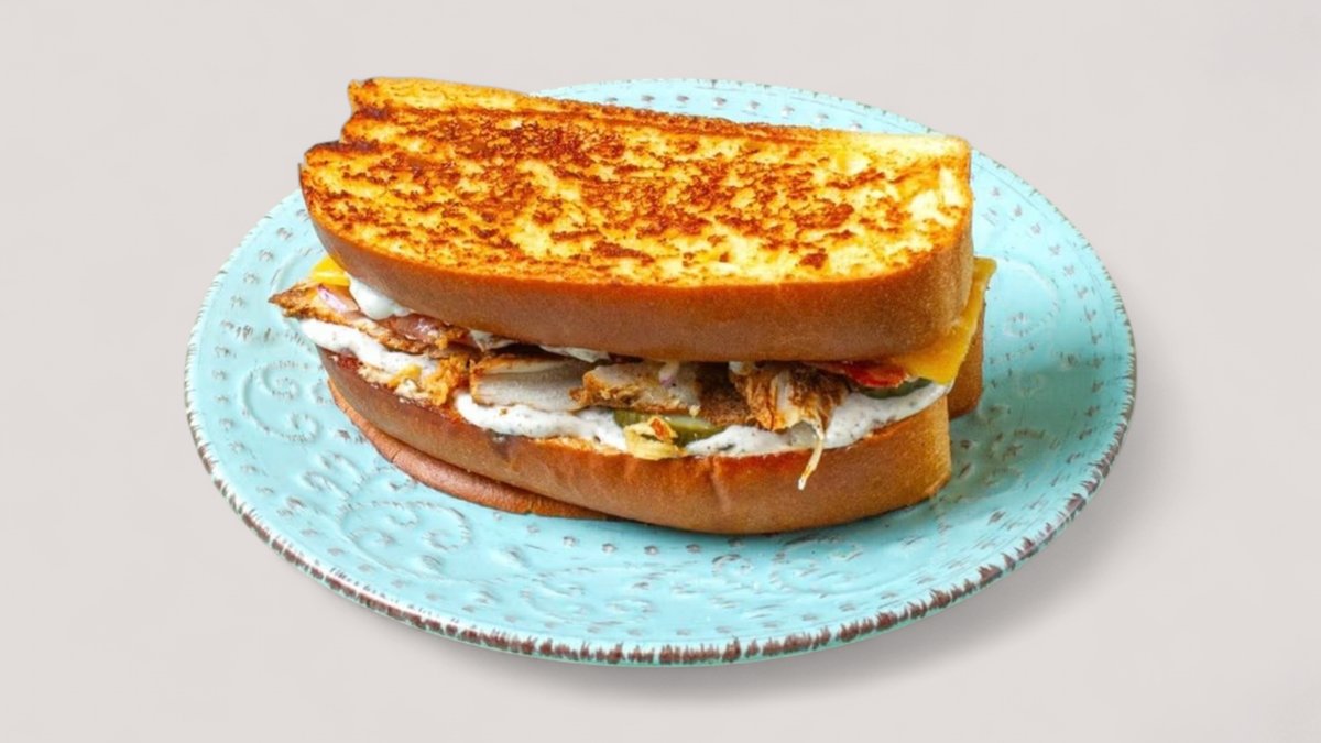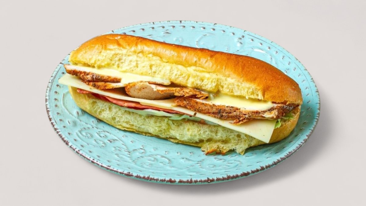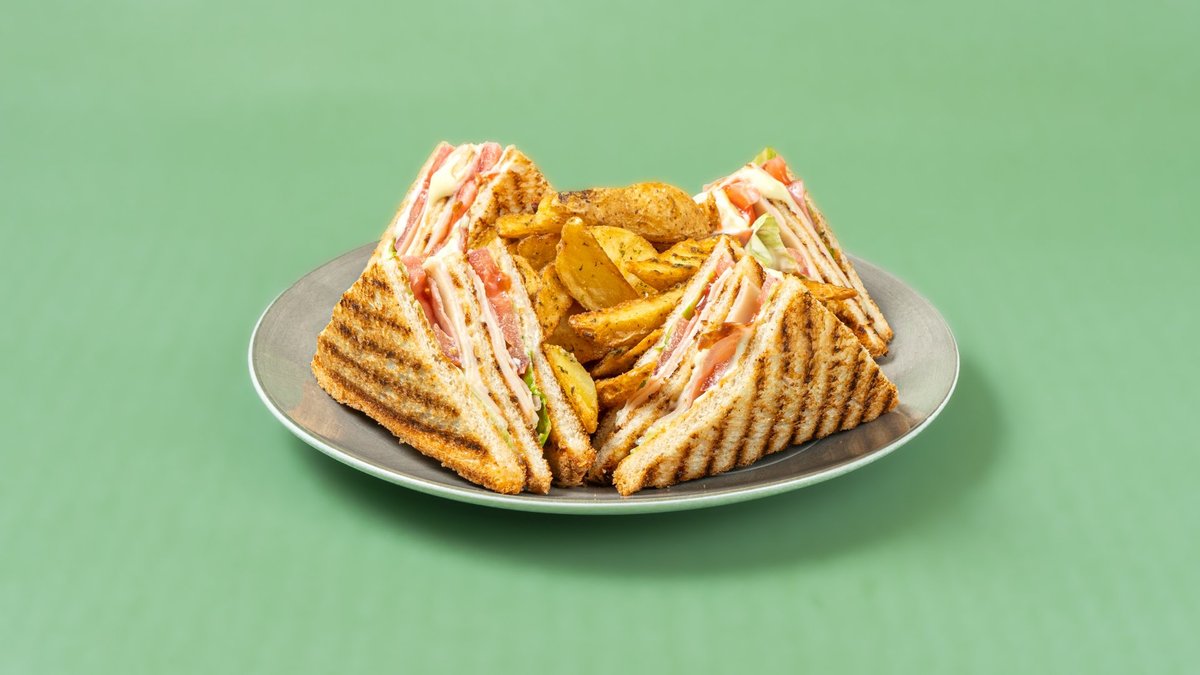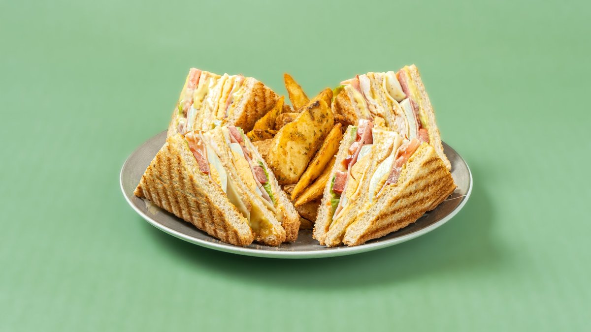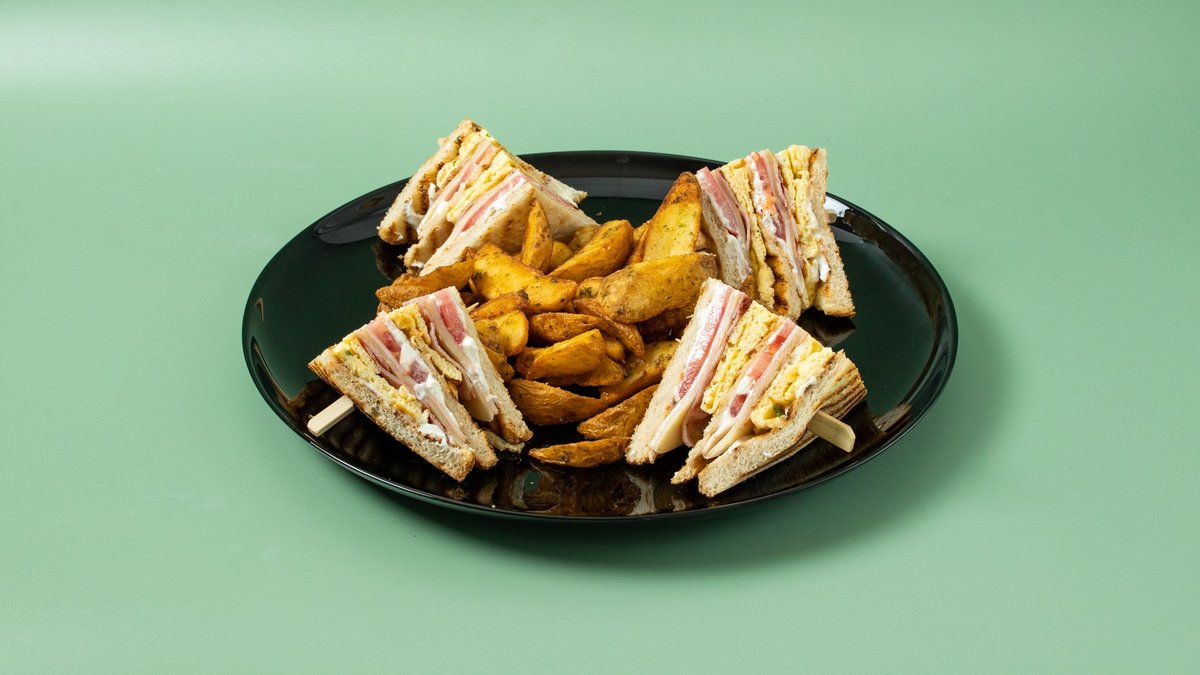 Με ομελέτα, γαλοπούλα, edam, μπέικον, ντομάτα και μαγιονέζα. Συνοδεύεται από πατάτες τηγανητές