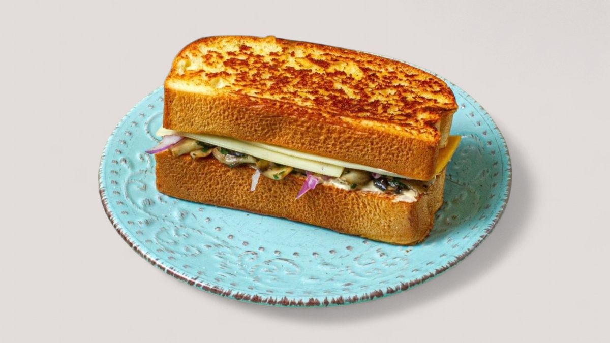 Με 2 αυγά τηγανητά, 2 φέτες ψωμί του τοστ, edam, μπέικον, λουκάνικο Φρανκφούρτης και μανιτάρια σωτέ.