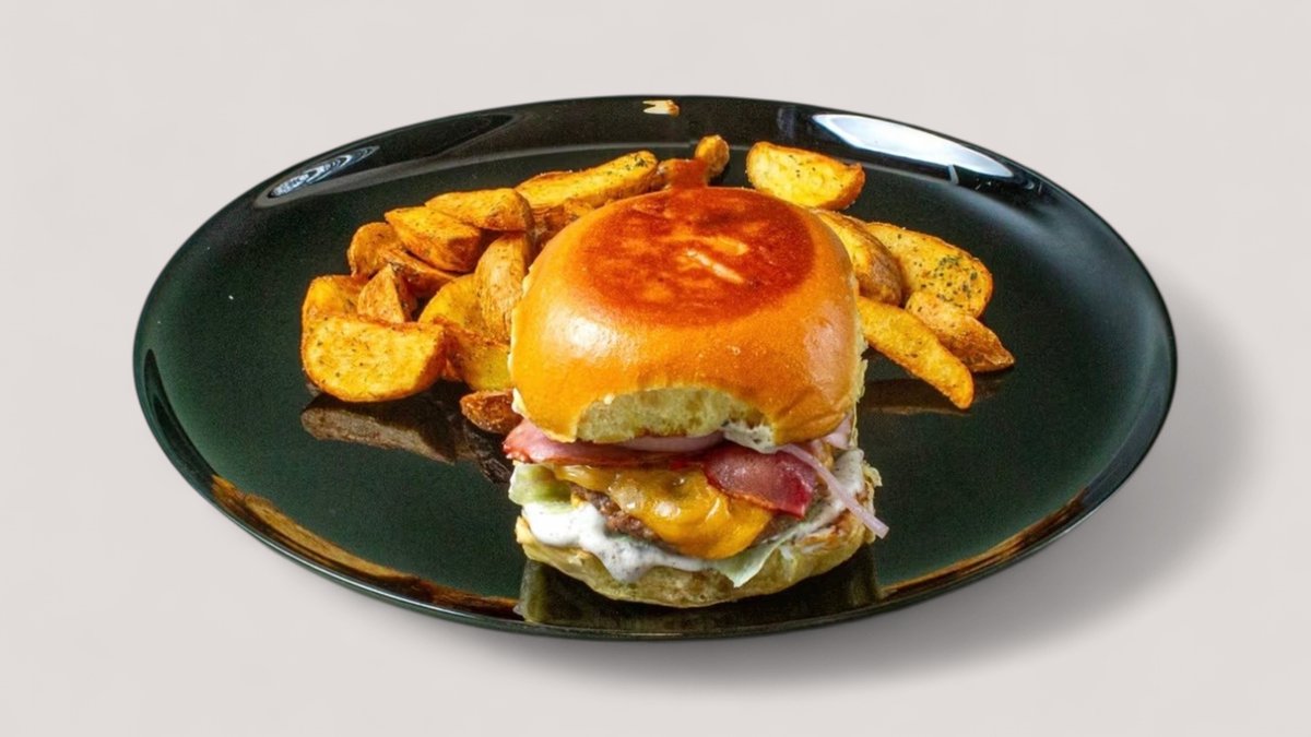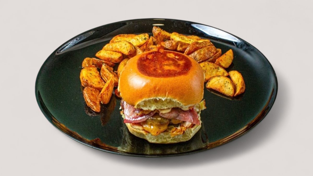 Πατατόψωμο με μοσχαρίσιο μπιφτέκι , τυρί cheddar , μπέικον , πίκλα αγγούρι , τραγανό κρεμμύδι & smoky mayo sauce