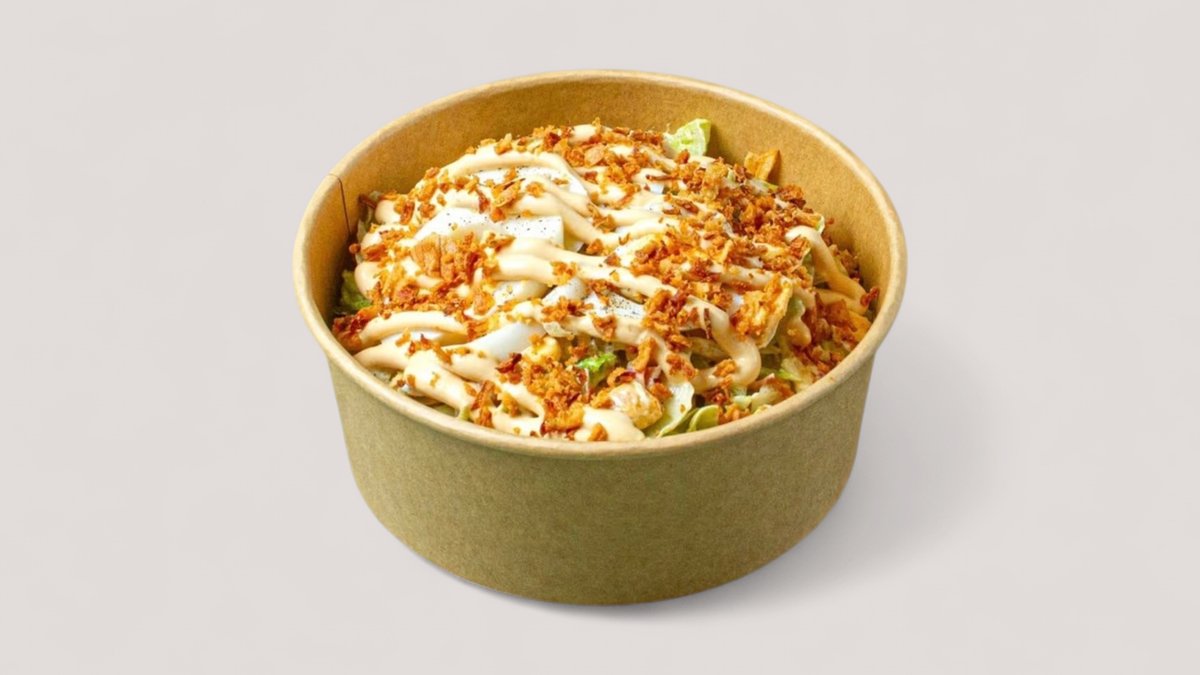 Σαλάτα με iceberg, καλαμπόκι, φιλέτο κοτόπουλο, μπέικον, flakes παρμεζάνας, κρουτόν και Caesar`s sauce