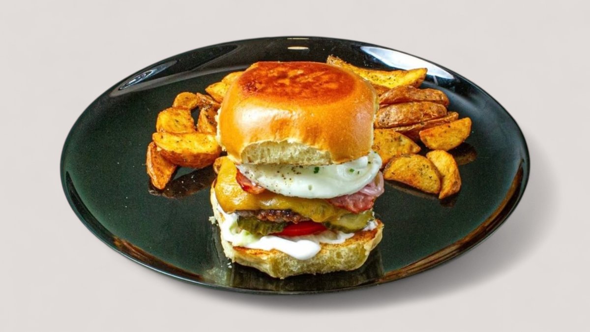 Πατατόψωμο με μοσχαρίσιο μπιφτέκι , τυρί cheddar , μπέικον , ντομάτα , iceberg , πίκλα κρεμμύδι , πίκλα αγγούρι , αυγό μάτι & μαγιονέζα
