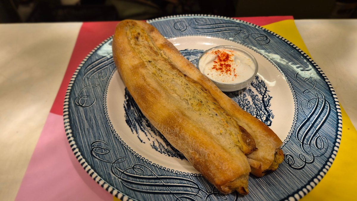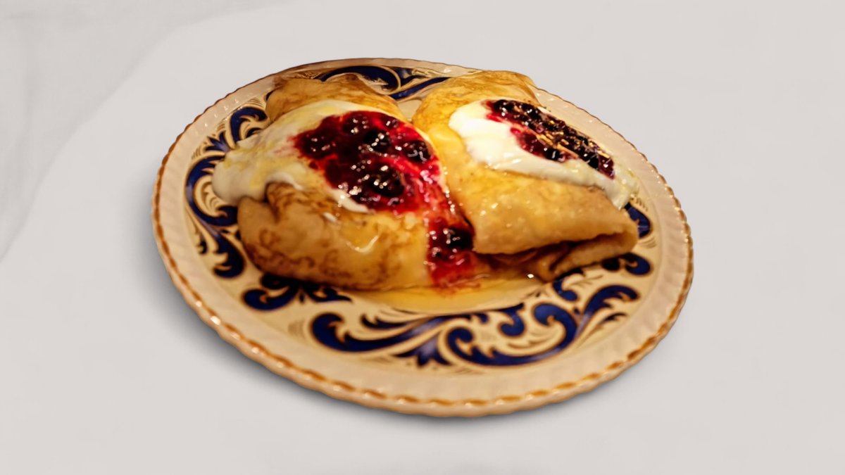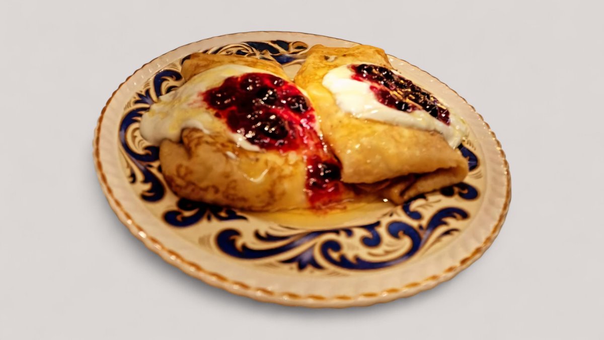 Καφές φίλτρου, 2 ναλίσνικ (ουκρανικές κρέπες) γεμισμένες με γλυκό τυρί, σερβίρονται με σμετάνα (sour cream), μέλι, μαρμελάδα με βατόμουρα και μύρτιλλα