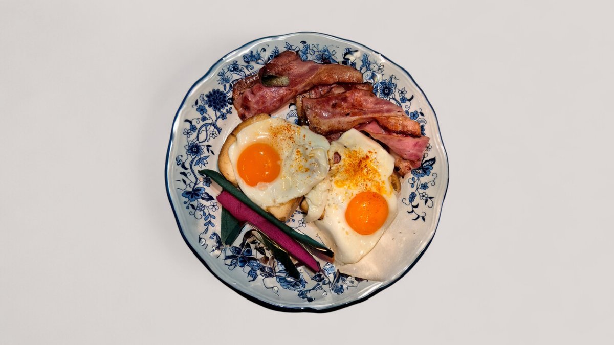 2 Αυγά μάτια, 2 κομμάτια μπέϊκον και 2 φέτες ψημένο ψωμί