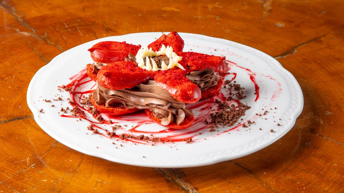 Σου σε σχήμα Demogorgon με cheesecake σοκολάτα & πραλίνα μπισκότου. Demogorgon-shaped choux filled with chocolate cheesecake & cookie praline.